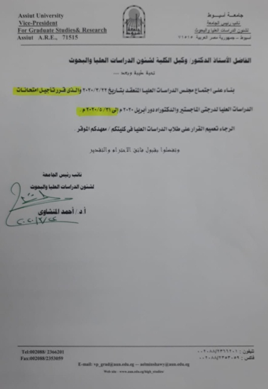 تأجيل امتحانات الدراسات العليا لدرجتي الماجستير والدكتوراه دور أبريل 2020م إلى 31/5/2020م 24 مارس 2020 تأجيل امتحانات الدراسات العليا لدرجتي الماجستير والدكتوراه دور أبريل 2020م إلى 31/5/2020م