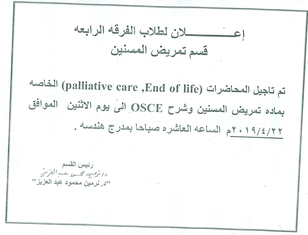 تأجيل محاضرات (End of life, palliative care) الخاصة بمادة تمريض المسنين وشرح OSCE 18 أبريل 2019 تأجيل محاضرات (End of life, palliative care) الخاصة بمادة تمريض المسنين وشرح OSCE