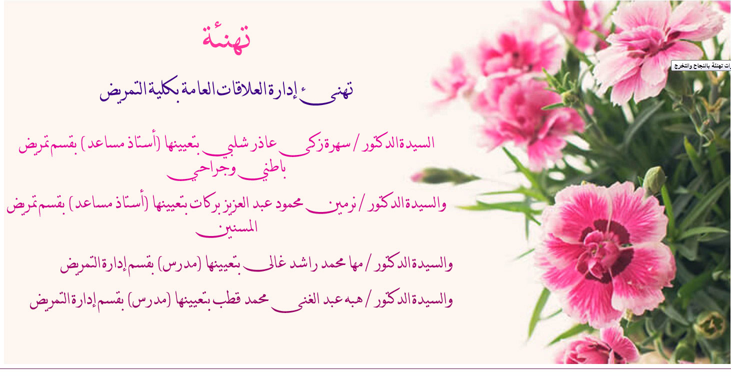 تهنئة بالترقية العلمية تتقدم السيدة الأستاذ الدكتور/ فاطمة رشدي محمد عميد كلية التمريض – جامعة أسيوط والسادة وكلاء الكلية، ورؤساء الأقسام الأكاديمية، وجميع أعضاء الجهاز الإداري،بأسمى آيات التهاني القلبية