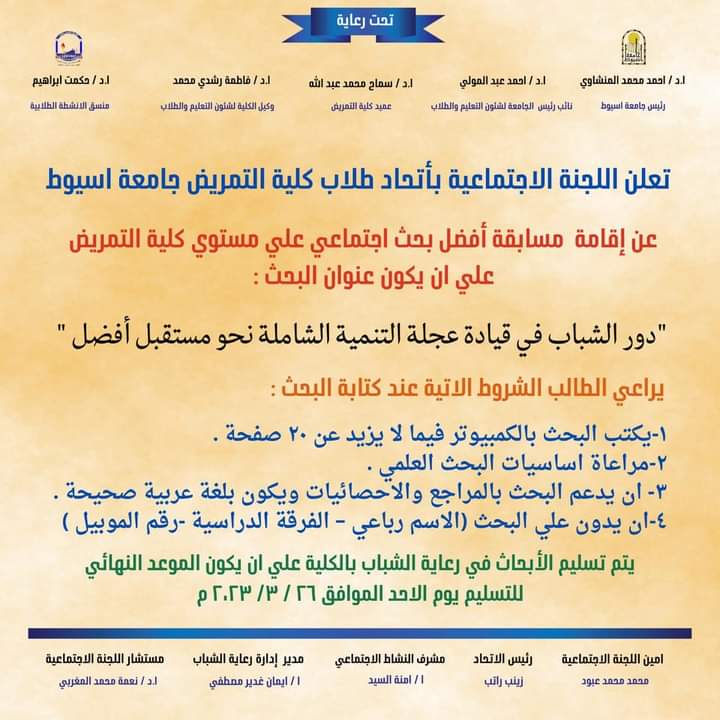 تعلن اللجنة الاجتماعية باتحاد طلاب كلية التمريض جامعة اسيوط عن إقامة مسابقة أفضل بحث اجتماعي علي مستوي كلية التمريض 19 مارس 2023