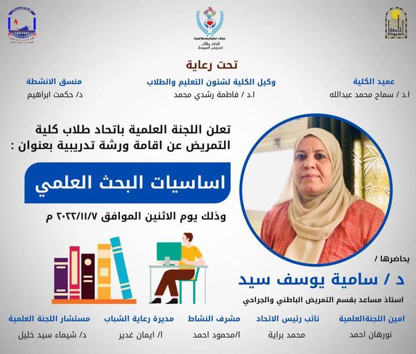 تعلن اللجنة العلمية باتحاد طلاب كلية التمريض عن إقامة ورشة تدريبية بعنوان اسااسيات البحث العلمى يوم الاثنين الموافق 2022/11/7م 6 نوفمبر 2022