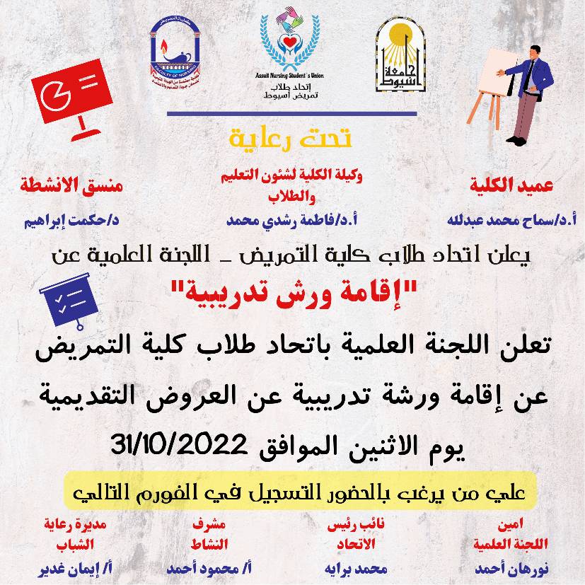 تعلن اللجنة العلمية باتحاد طلاب تمريض عن إقامة ورشة تدريبية عن العروض التقديمية برحاب الكلية يوم الاثنين الموافق 31/10/2022 30 أكتوبر 2022
