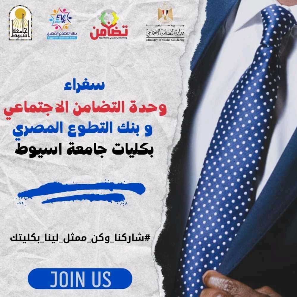 تعلن وحدة التضامن الإجتماعى بجامعة أسيوط عن اختيار سفراء لها من طلاب كليات جامعة أسيوط من متطوعي الوحدة فعلي من يرغب في الترشح كسفير للوحدة بكليته التوجه لمقر الوحدة يوم الأحد الموافق ٦/ ١١/ ٢٠٢٢م