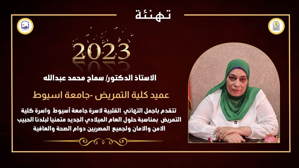 تتقدم السيد الأستاذ الدكتور/ سماح محمد عبدالله عميد الكلية بأجمل التهاني القلبية لأسرة جامعة أسيوط وأسرة كلية التمريض بمناسبة حلول العام الميلادي الجديد متمنيا لبلدنا الحبيب الأمن والأمان ولجميع المصريين دوام الصحة والعافية