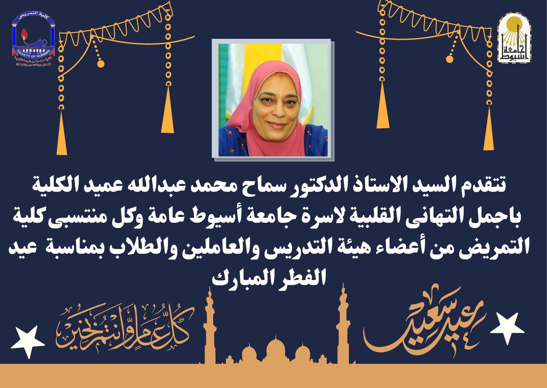 تتقدم السيد الاستاذ الدكتور/ سماح محمد عبدالله عميد الكلية بأجمل التهانى القلبية لأسرة جامعة أسيوط عامة 28 أبريل 2022 وكل منتسبى كلية التمريض من أعضاء هيئة التدريس والعاملين والطلاب بمناسبة عيد الفطر المبارك اعاده الله عليكم بالخير واليمن والبركات