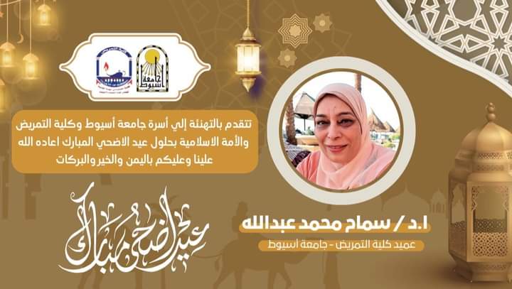 تتقدم السيد الاستاذ الدكتور سماح محمد عبدالله عميد الكلية باجمل التهانى القلبية لجميع السادة اعضاء هيئه التدريس ومعاونيه والعاملين وأبنائها الطلاب بجامعه اسيوط وكليه التمريض وجموع المسلمين بمناسبه عيد الأضحى المبارك
