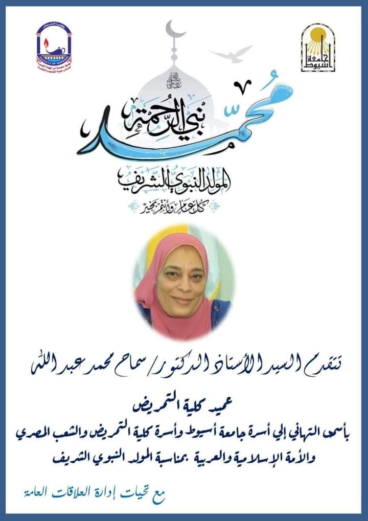 تتقدم السيد الاستاذ الدكتور سماح محمد عبدالله عميد الكلية بأجمل التهاني إلى أسرة جامعة اسيوط وأسرة كلية التمريض والشعب المصرى والأمة الإسلامية والعربية بمناسبة المولد النبوي الشريف كل عام وانتم بخير