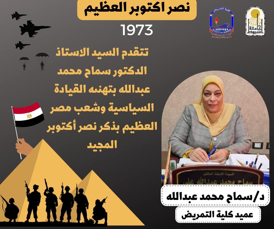 تتقدم السيد الأستاذ الدكتور/ سماح محمد عبدالله عميد الكلية بتهنئة القيادة السياسية وشعب مصر العظيم بذكر بنصر أكتوبر المجيد 6 أكتوبر 2022 كل عام ومصر في عزة ونصر تحية إعزاز لشهداء مصر الأبرار تحية لشعب مصر وجيشها العظيم