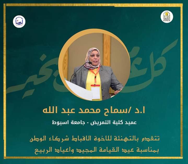 تتقدم السيد الاستاذ الدكتور سماح محمد عبدالله عميد الكلية والسادة الوكلاء والسادة اعضاء هيئه التدريس والعاملين بالكلية والطلاب باجمل التهانى القلبية للاخوة الاقباط شركاء الوطن بمناسبة عيد القيامة المجيد واعياد الربيع