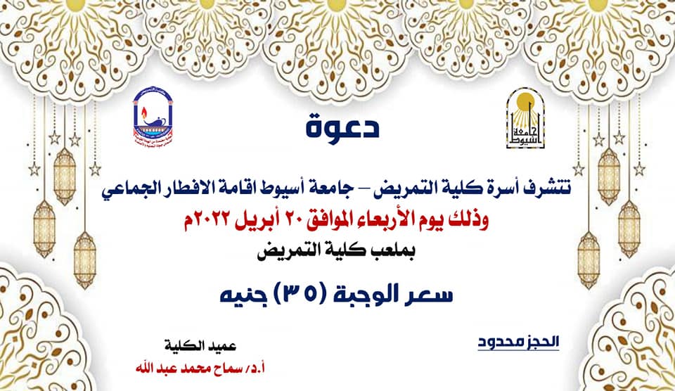 لحفل الإفطار الجماعى المزمع عقد يوم الأربعاء الموافق ٢٠ أبريل ٢٠٢٢ بملعب كلية التمريض .