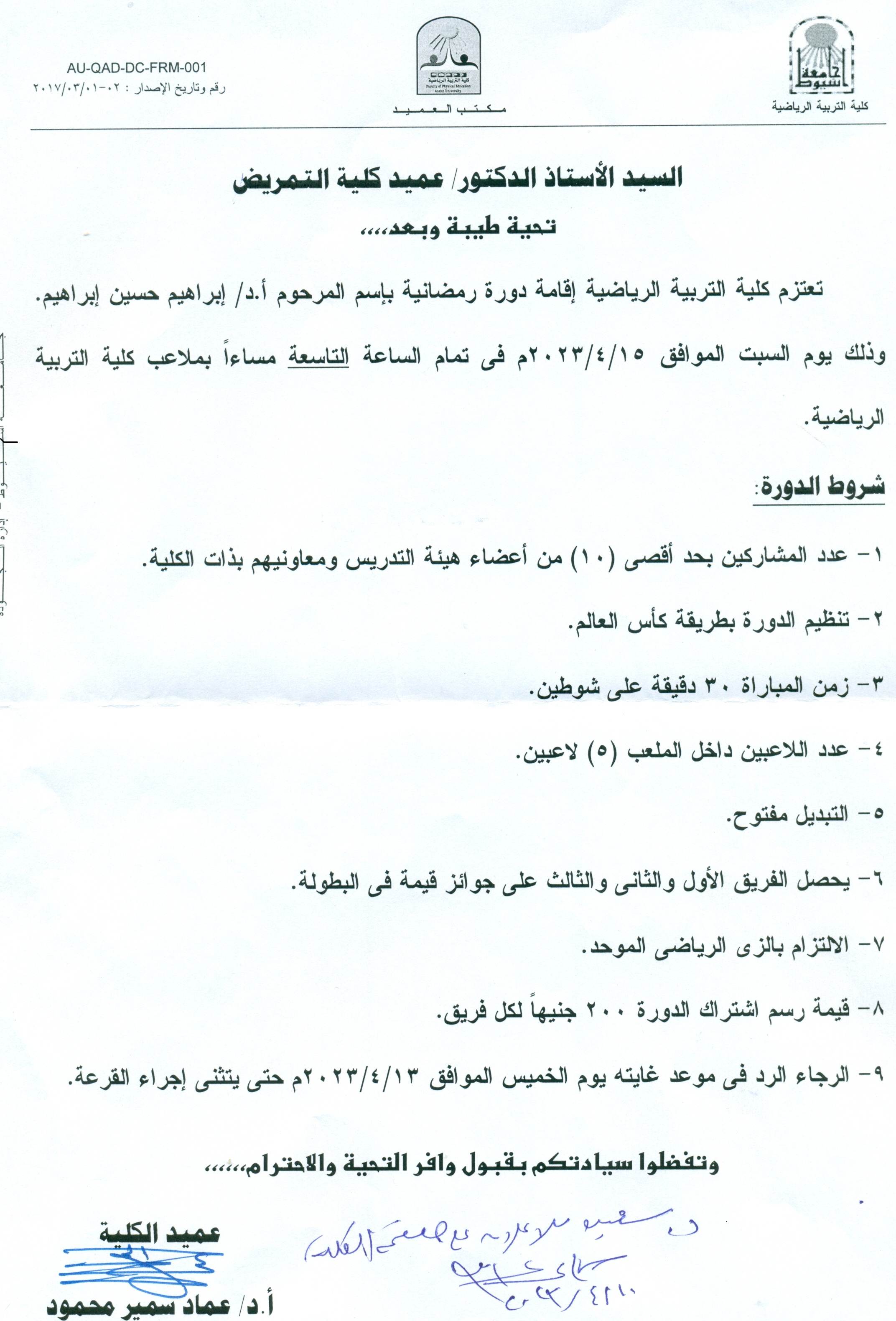 تعتزم كلية التربية رياضية إقامة دورة رمضانية بأسم المرحوم أ./ ابراهيم حيسن ابراهيم وذلك يوم السبت الموافق 15/4/2023 في تمام الساعة التاسعة مساءًا بملاعب كلية التربية الرياضية