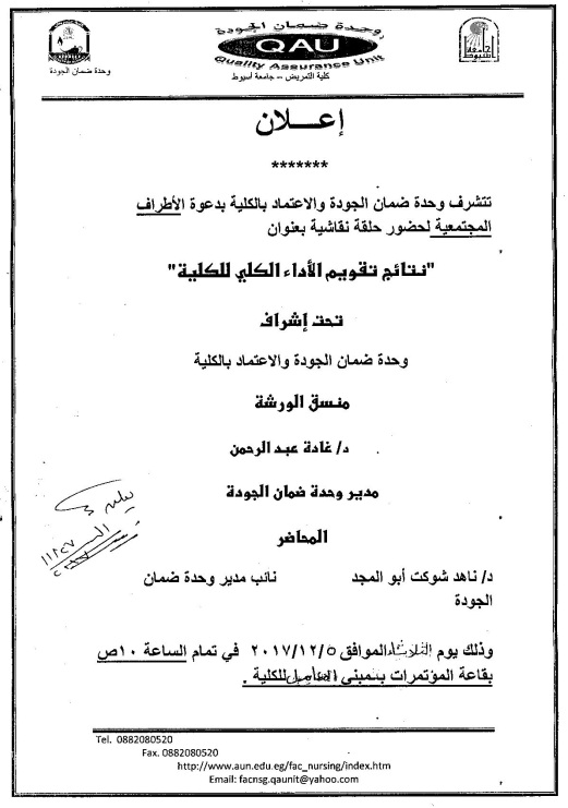 وحدة ضمان الجودة والاعتماد بالكلية تدعو الأطراف المجتمعية لحضور حلقة نقاشية بعنوان "نتائج تقويم الأداء الكلي للكلية"