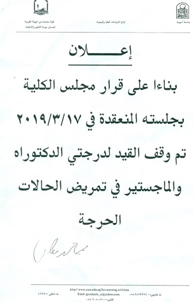 وقف القيد لدرجتي الدكتوراه والماجستير في تمريض الحالات الحرجة 4 يوليو 2019 وقف القيد لدرجتي الدكتوراه والماجستير في تمريض الحالات الحرجة