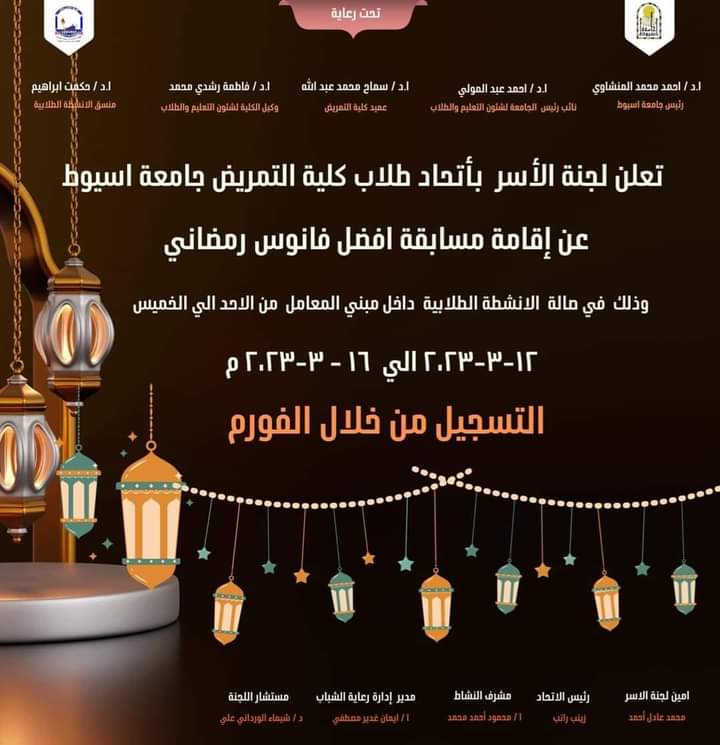 تحت رعاية أ.د سماح محمد عبدالله عميد الكلية أ.د فاطمة رشدي محمد وكيل الكلية لشئون التعليم والطلاب د/ شيماء الورداني علي مستشار لجنة الاسر بالكلية أ/ايمان غدير مصطفي مدير إدارة رعاية الشباب يعلن اتحاد طلاب كلية التمريض - لجنة الاسر الطلابية عن مسابقة (افضل فانوس رمضاني( الذي يتم من خلال ورشة العمل التي تقام بصالة الانشطة الطلابية بالكلية من يوم الاحد ١٢- ٣ الي الخميس ١٦-٣ -٢٠٢٣م و يتم توفير الخامات من الكلية و منح جوائز مادية للمراكز الاولي..