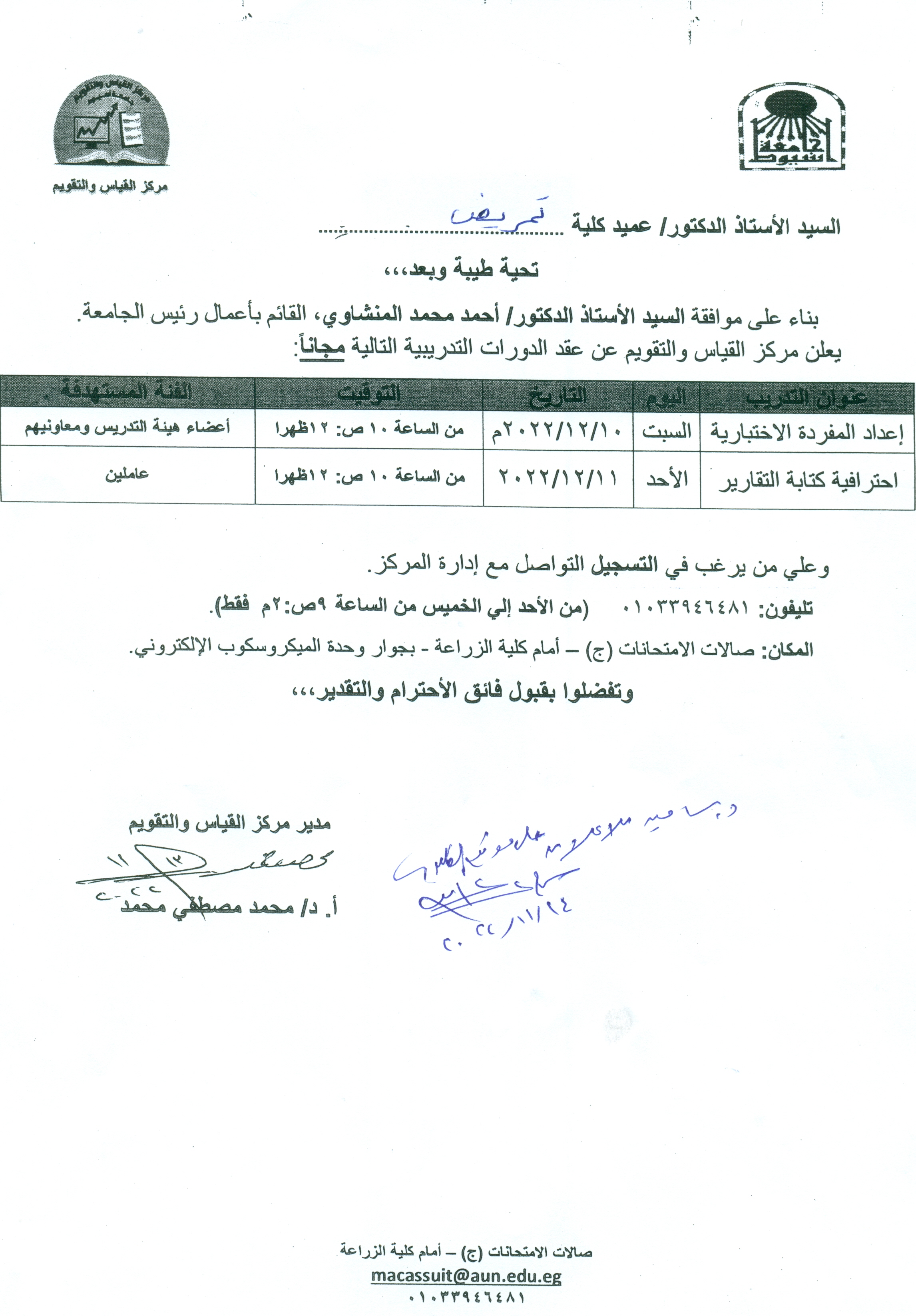 يعلن مركز القياس والتقويم عن عقد الدورات التدريبية التالية مجاناً 14 نوفمبر 2022 على من يرغب فى التسجيل التواصل مع إدارة المركز تليفون: 01033946481 (من الأحد الى الخميس من الساعة 9ص : 2م فقط) المكان : صالات الامتحانات (ج) - أمام كلية الزراعة - بجوار وحدة الميكروسكوب الإلكتروني