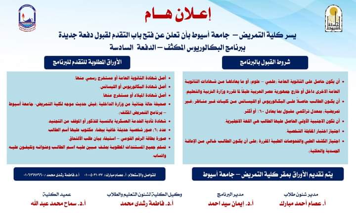 يسر كلية التمريض جامعة اسيوط ان تعلن عن فتح باب القبول دفعة جديدة ببرنامج البكالوريوس المكثف _ الدفعة السادسة اخر ميعاد لتقديم واستلام الاوراق السبت ٢٠٢٣/٥/٦