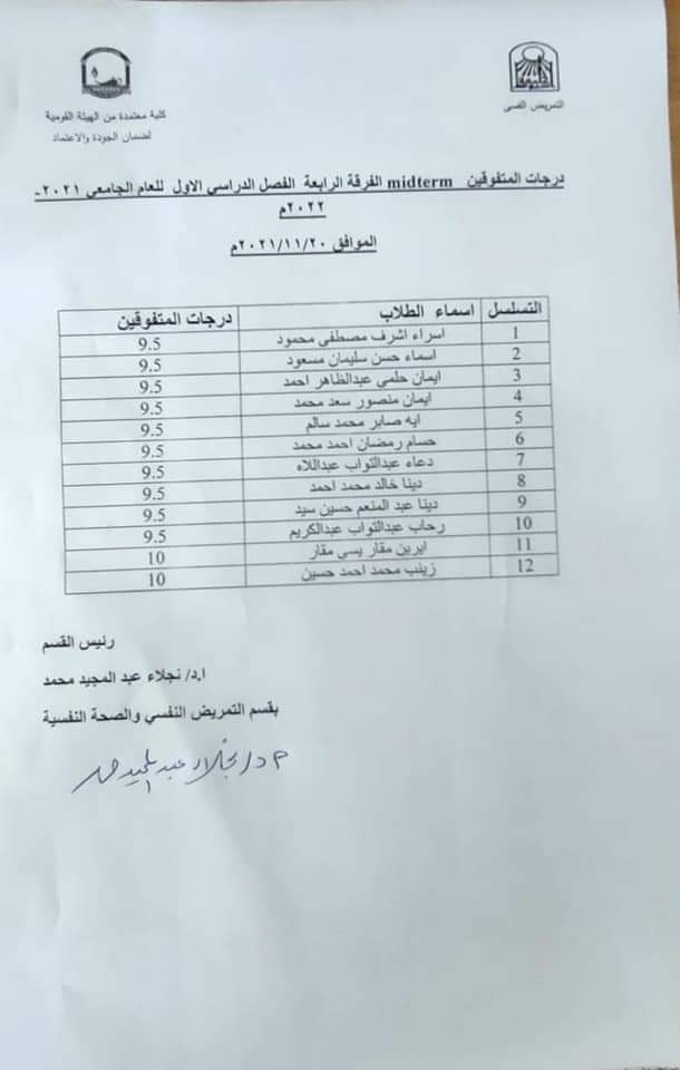 درجات المتفوقين الفرقة الرابعة فصل دراسي اول