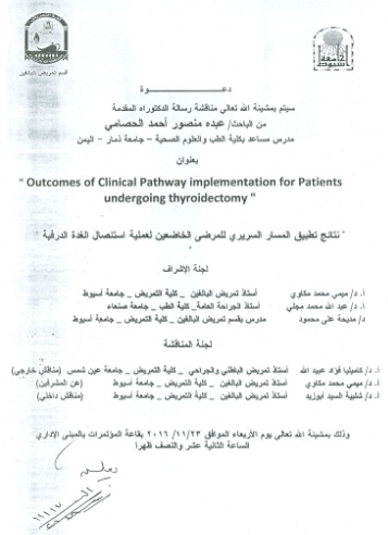 By God willing, doctoral thesis submitted by researcher/ Abdo Mansour Ahmed El-Hosamy – assistant lecturer, Faculty of Medicine and Health Sciences, Thamar University, Yemen - will be discussed on Wednesday, 23/11/2016, at 12:30 p.m., at the conference hall of the college.
