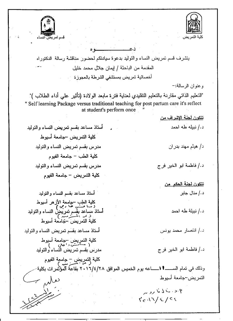 By God willing, doctoral thesis submitted by researcher/ Eman Galal Mohamed Khalil - Nursing specialist, Police Hospital, Agouza- will be discussed on Thursday, 28/4/2016, at 11:00 a.m., at the conference hall of the college. Thesis Title: " Self learning package versus traditional teaching for post partum care it's reflect at students's perform once "