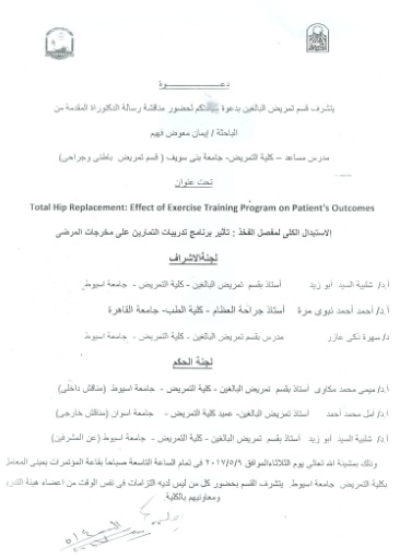 By God willing, doctoral thesis submitted by researcher/ Eman Mawad Faheem, assistant lecturer, Adult Nursing department, Faculty of Nursing, Beni Suef University, will be discussed on Tuesday, 9/5/2017, at 9:00 a.m., at the conference hall of the college.
