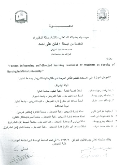 By God willing, doctoral thesis submitted by researcher/ Faten Ali Ahmed, assistant lecturer, Nursing Administration department, Faculty of Nursing, Minia University- will be discussed on Monday, 20/2/2017, at 1:00 p.m., at the conference hall of the college.