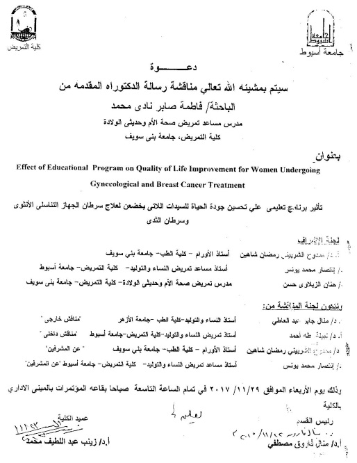 By God willing, doctoral thesis submitted by researcher/ Fatma Saber Nady Mohamed - assistant lecturer, Maternal & Newborn Health Nursing Department, Faculty of Nursing, Beni Suef University- will be discussed on Wednesday, 29/11/2017, at 9:00 a.m., at the conference hall of the college.