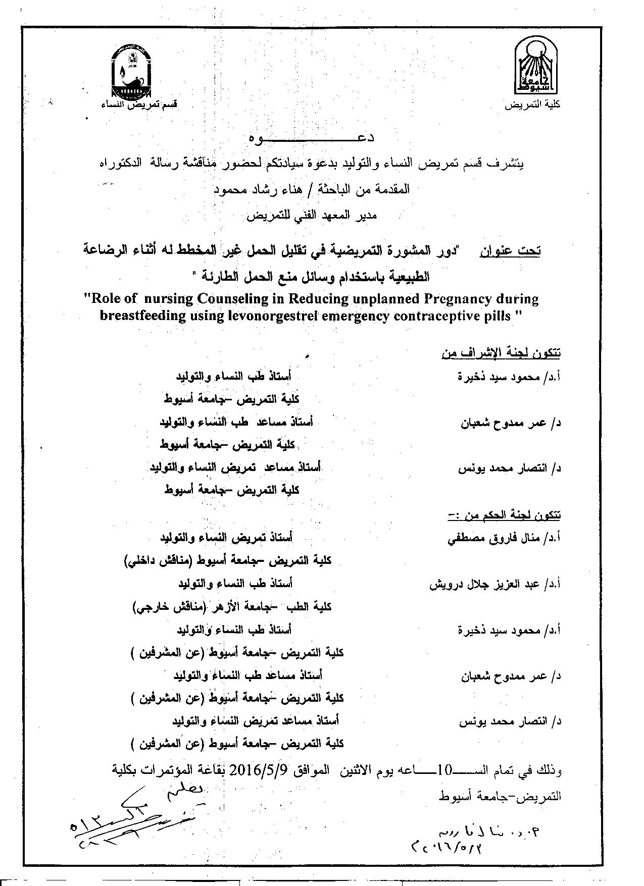 By God willing, doctoral thesis submitted by researcher/ Hana Rashad Mahmoud- Director of technical nursing institute, Assiut University- will be discussed on Monday, 9/5/2016, at 10:00 a.m., at the conference hall of the college.