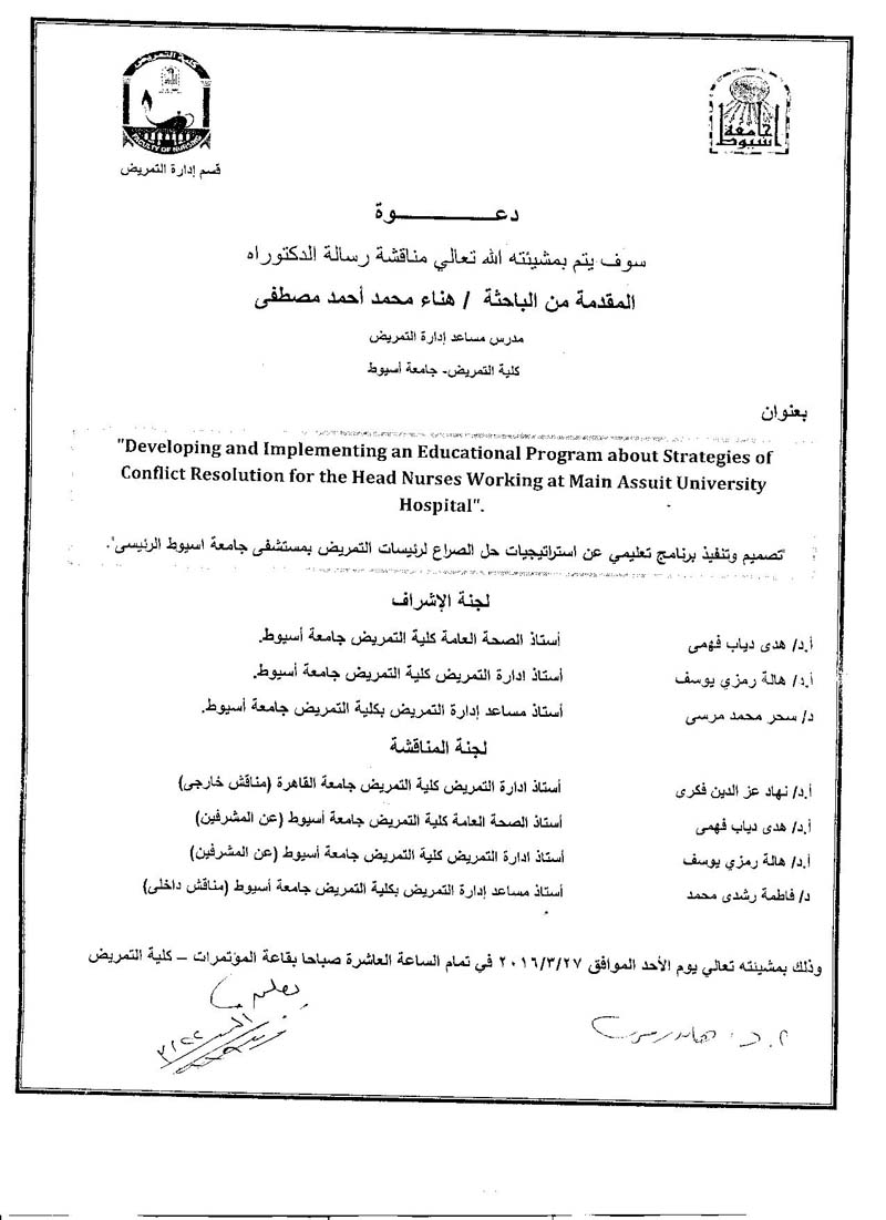 By God willing, doctoral thesis submitted by researcher/ Hanaa Mohamed Ahmed Mustafa - assistant lecturer, Nursing Service Administration Department, Faculty of Nursing, Assiut University - will be discussed on Sunday, 27/3/2016, at 10:00 a.m., at the conference hall of the college. Thesis Title: " Developing and implementing and educational program about strategies of conflict resolution for the head nurses working at Main Assiut University Hospital "