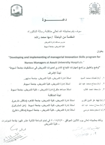By God willing, doctoral thesis submitted by researcher/ Maha Mohammed Rashid, assistant lecturer, Nursing Administration department, Faculty of Nursing, Assiut University- will be discussed on Monday, 20/2/2017, at 12:00 noon, at the conference hall of the college.