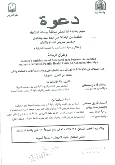 By God willing, doctoral thesis submitted by researcher/ Mona Ahmed Sayed Gad El-Haq, Nursing Specialist, will be discussed on Thursday, 11/5/2017, at 12:00 noon, at the conference hall of the college.