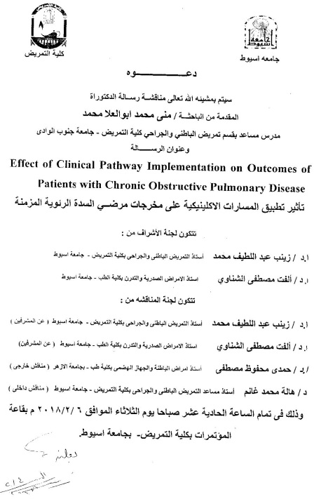 By God willing, doctoral thesis submitted by researcher/ Mona Mohamed Abuel-Elala Mohamed - assistant lecturer, Surgical-abdominal Nursing Department, Faculty of Nursing, South Valley University, will be discussed on Tuesday, 6/2/2018, at 11:00 a.m., at the conference hall of the college.