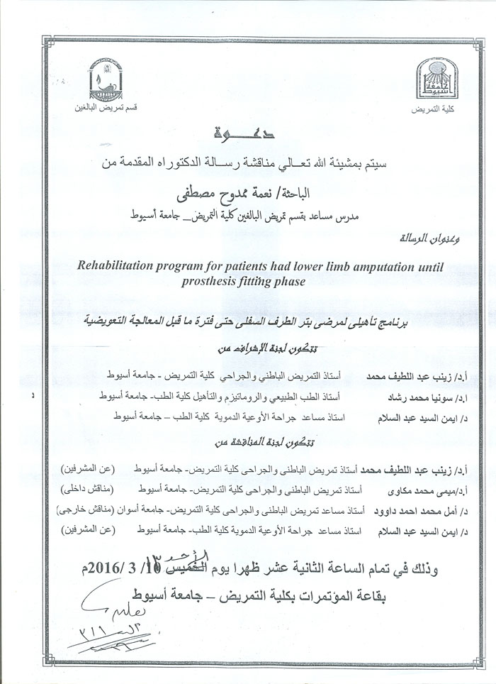 By God willing, doctoral thesis submitted by researcher/ Neama Mamdouh Mostafa - assistant lecturer, Adult Nursing Department, Faculty of Nursing, Assiut University - will be discussed on Sunday, 13/3/2016, at 12:00 noon, at the conference hall of the college. Thesis Title: " Rehabilitation program for patients had lower limb amputation until prosthesis fitting phase "