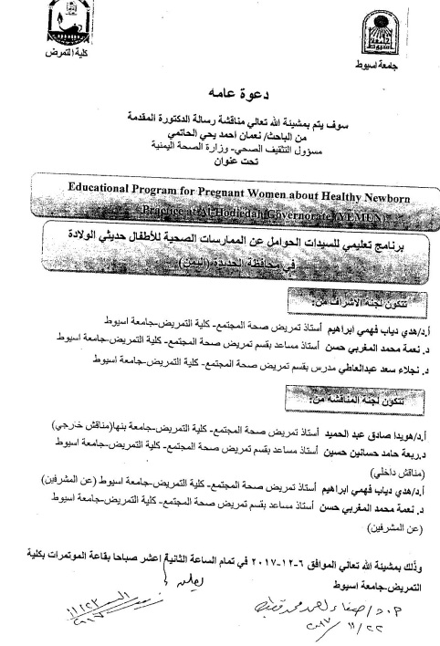 By God willing, doctoral thesis submitted by researcher/ Numan Ahmed Yahya Al – Hatami- Health Education Officer, Ministry of Health (Yemen)- will be discussed on Wednesday, 6/12/2017, at 10:00 a.m., at the conference hall of the college.