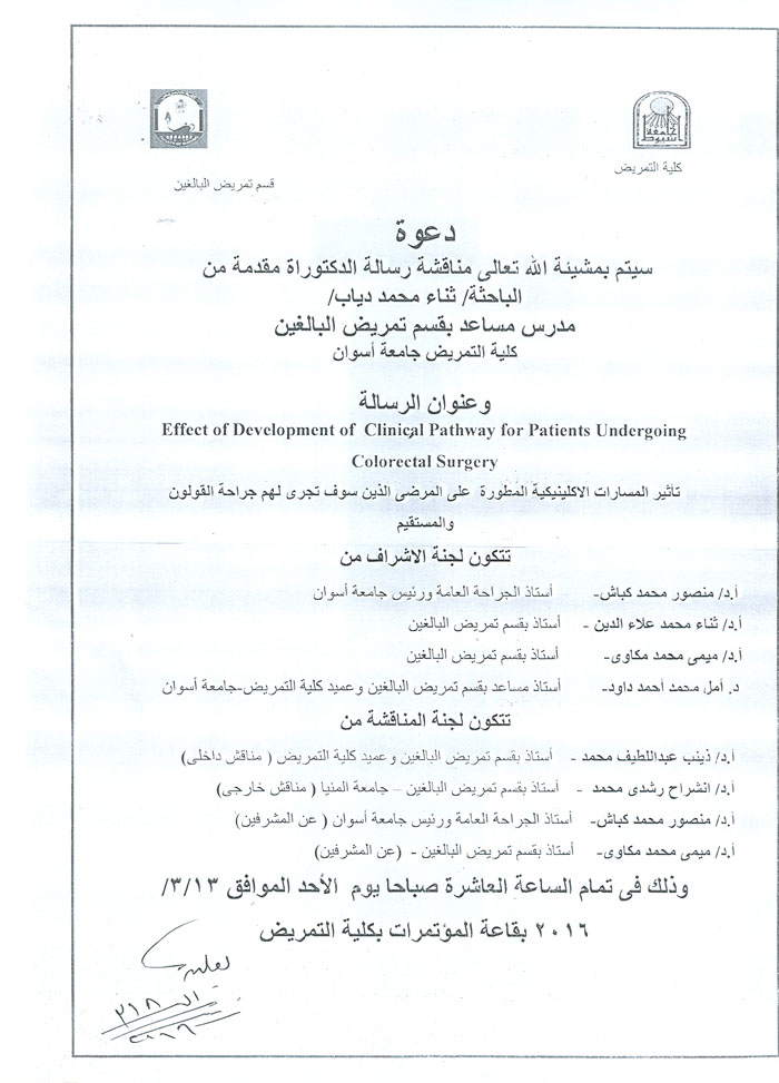 By God willing, doctoral thesis submitted by researcher/ Sanaa Mohamed Diab - assistant lecturer, Adult Nursing Department, Faculty of Nursing, Aswan University - will be discussed on Sunday, 13/3/2016, at 10:00 a.m., at the conference hall of the college.