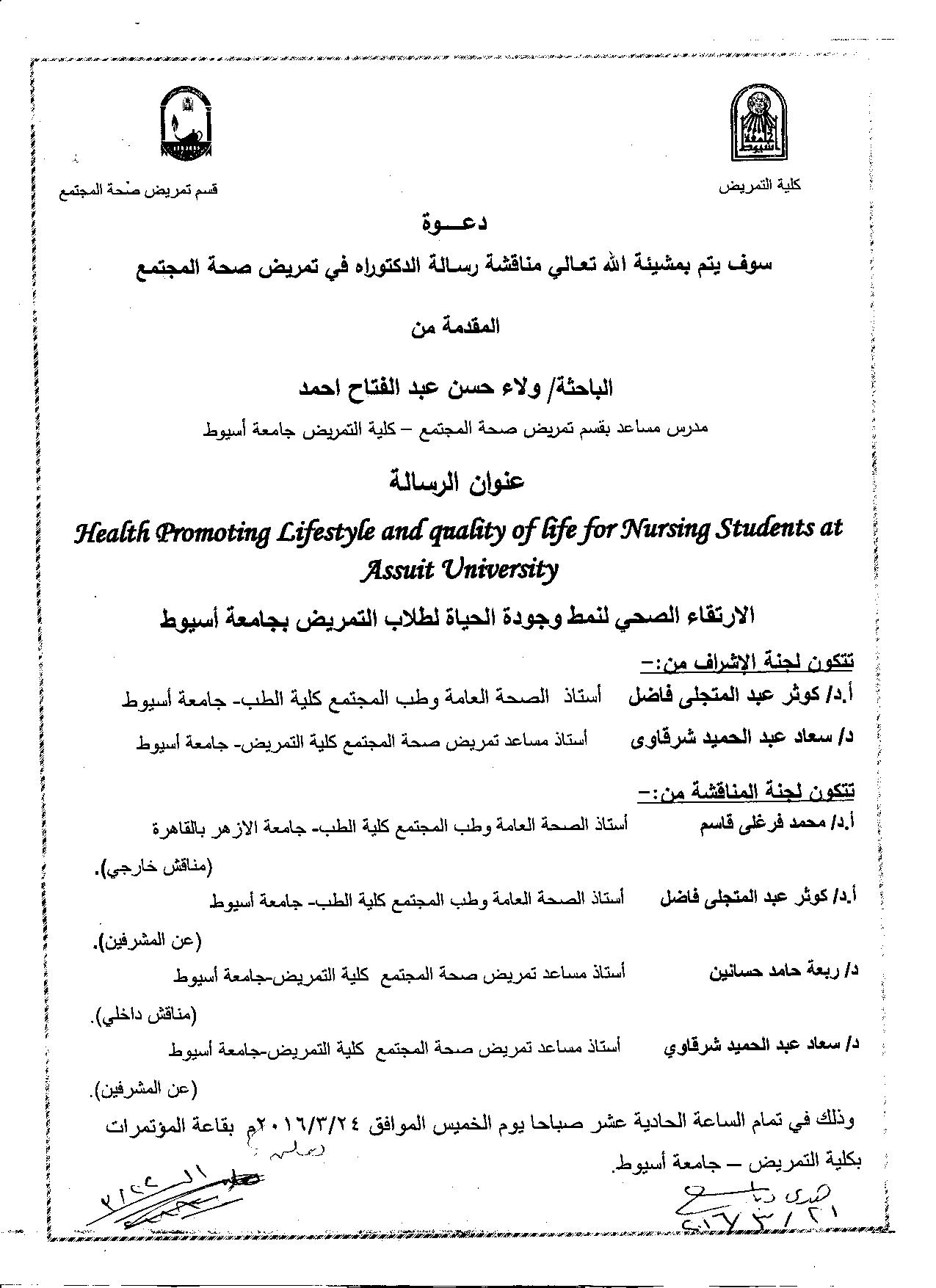 By God willing, doctoral thesis submitted by researcher/ Walaa Hassan Abdal-Fatah - assistant lecturer, Public Health Nursing Department, Faculty of Nursing, Assiut University - will be discussed on Thursday, 24/3/2016, at 11:00 a.m., at the conference hall of the college.