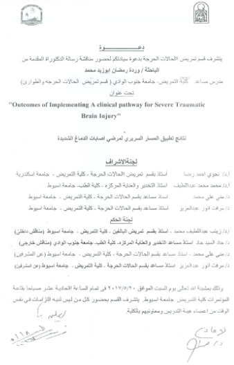 By God willing, doctoral thesis submitted by researcher/ Warda Ramadan Abu Zeid Mohamed, assistant lecturer, Critical Care Nursing department, Faculty of Nursing, South Valley University, will be discussed on Saturday, 20/5/2017, at 11:00 a.m., at the conference hall of the college.