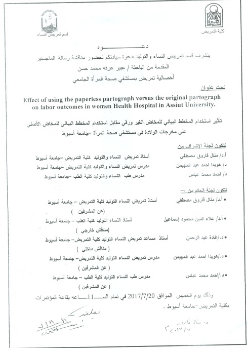 By God willing, master thesis submitted by researcher/ Abeer Arafa Mohamed Hassan, Nursing Specialist, will be discussed on Thursday, 20/7/2017, at 11:00 a.m., at the conference hall of the college.
