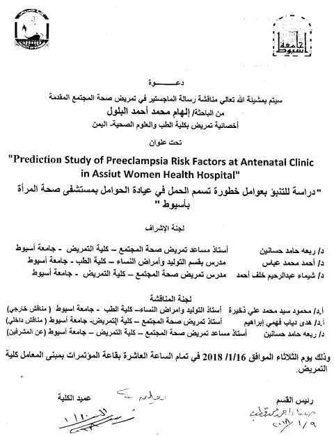 By God willing, master thesis submitted by researcher/ Elham Mohamed Ahmed El-Baloul - Nursing Specialist, Faculty of Medicine and Health Sciences, Yemen - will be discussed on Tuesday, 16/1/2018, at 10:00 a.m., at the conference hall of the college.