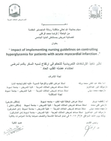 " Impact of implementing nursing guidelines on controlling hyperglycemia for patients with acute myocardial infarction "