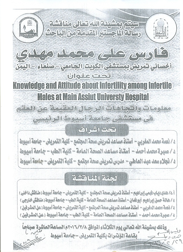 By God willing, master thesis submitted by researcher/ Fares Ali Mohamed Mahdy - nursing specialist, Kuwait University Hospital, Sanaa, Yemen - will be discussed on Tuesday, 8/3/2016, at 10:00 a.m., at the conference hall of the college.