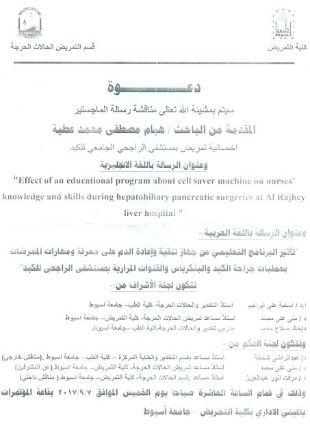 By God willing, master thesis submitted by researcher/ Hiyam Mustafa Mohamed Attieh, Nursing Specialist, will be discussed on Thursday, 7/9/2017, at 10:00 a.m., at the conference hall of the college.