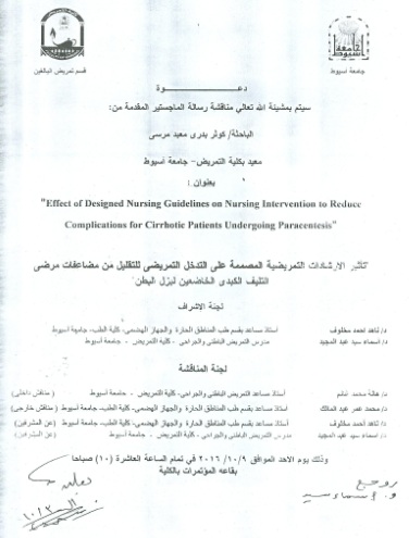 By God willing, master thesis submitted by researcher/ Kawther Badry Mobed Morsy - demonstrator, Adult Nursing, Faculty of Nursing, Assiut University - will be discussed on Sunday, 9/10/2016, at 10:00 a.m., at the conference hall of the college.