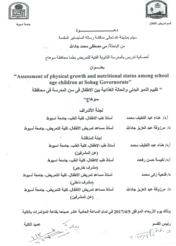 By God willing, master thesis submitted by researcher/ Mai Mostafa Mohamed Gadallah, Teaching Specialist, will be discussed on Wednesday, 5/4/2017, at 11:00 a.m., at the conference hall of the college.