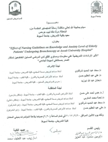 By God willing, master thesis submitted by researcher/ Martha Melek Labeib Gerges, demonstrator, Geriatric Nursing department, Faculty of Nursing, Assiut University- will be discussed on Monday, 20/2/2017, at 9:30 a.m., at the conference hall of the college. Thesis Title: " Effect of nursing guidelines on knowledge and anxiety level of elderly patients' undergoing bronchoscopy at Assuit University Hospital "