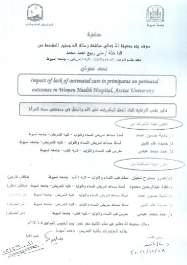 By God willing, master thesis submitted by researcher/ Mona Rabie Ahmed Mohamed - demonstrator, Gynecology and Obstetrics Nursing department, Faculty of Nursing, Assiut University - will be discussed on Thursday, 5/1/2017, at 12:00 noon, at the conference hall of the college. Thesis Title: " Impact of lack of antenatal care in primiparas on perinatal outcomes in Women Health Hospital, Assiut University "