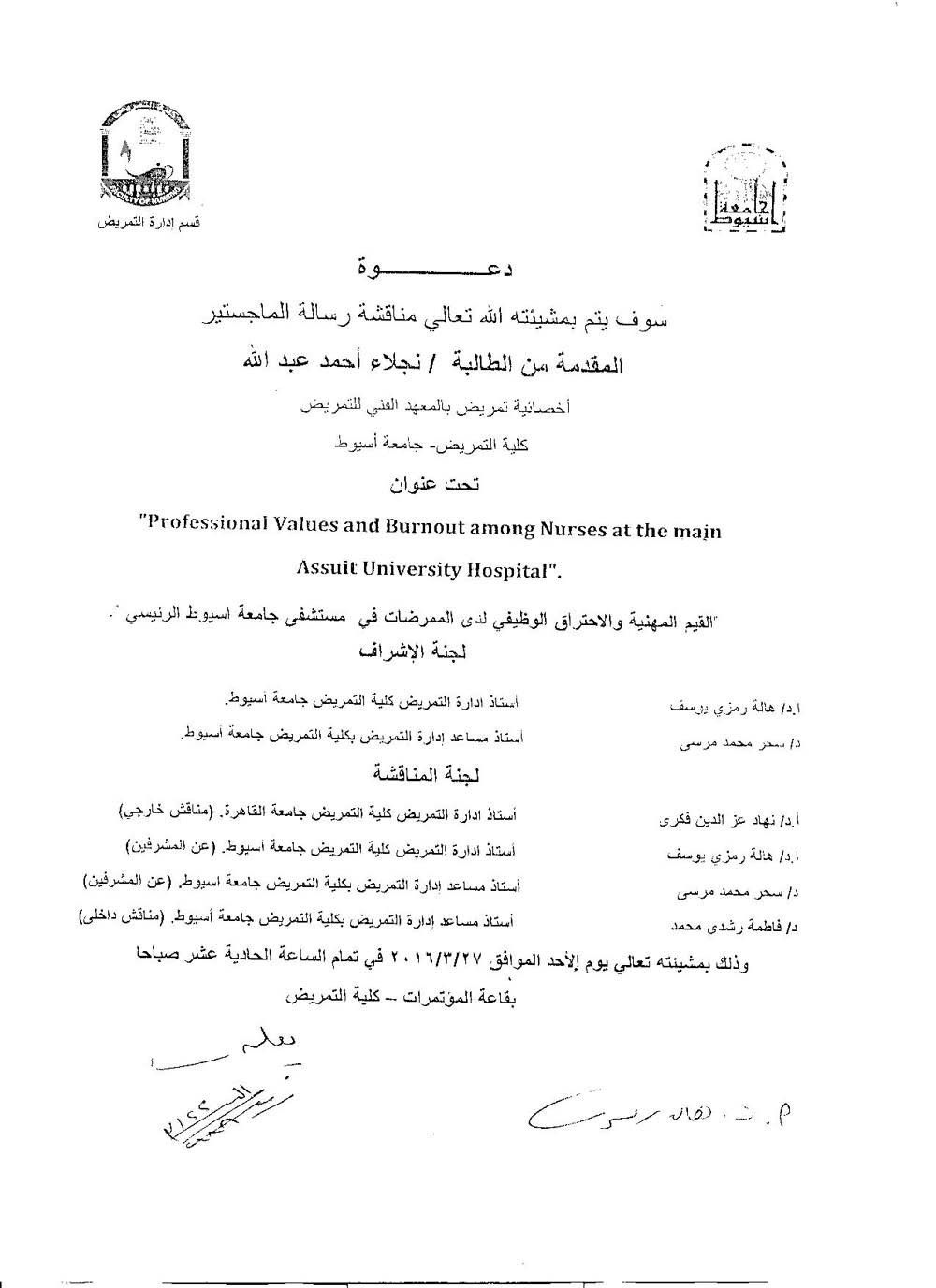 By God willing, master thesis submitted by researcher/ Naglaa Ahmed Abd Allah - nursing specialist, Technical Institute of Nursing, Assiut University - will be discussed on Sunday, 27/3/2016, at 11:00 a.m., at the conference hall of the college. Thesis Title: " Professional values and burnout among nurses at the main Assiut University Hospital "