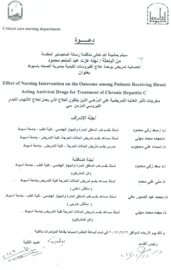 By God willing, master thesis submitted by researcher/ Nahla Ezat Abdel-Moneam, Nursing Specialist, will be discussed on Wednesday, 22/2/2017, at 10:00 a.m., at the conference hall of the college.