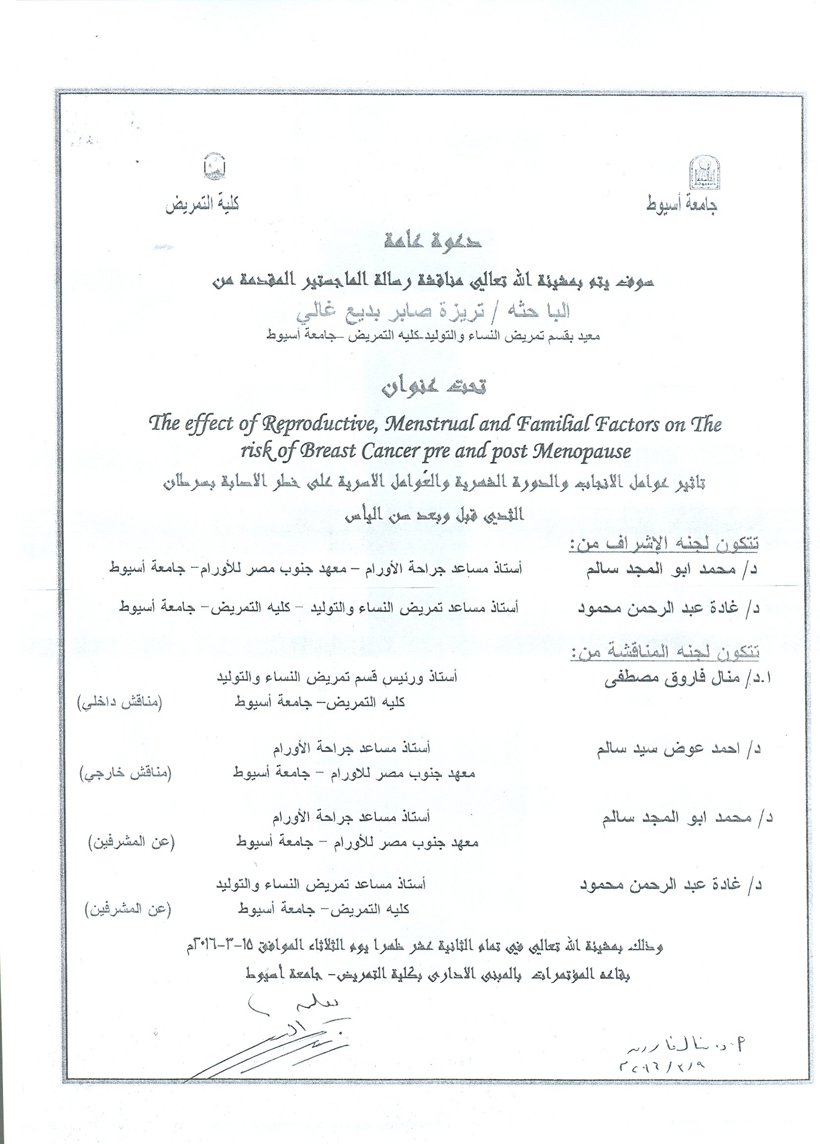 By God willing, master thesis submitted by researcher/ Neama Mamdouh Mostafa - demonstrator, Gynecology and Obstetrics Nursing Department, Faculty of Nursing, Assiut University - will be discussed on Tuesday, 15/3/2016, at 12:00 noon, at the conference hall of the college.