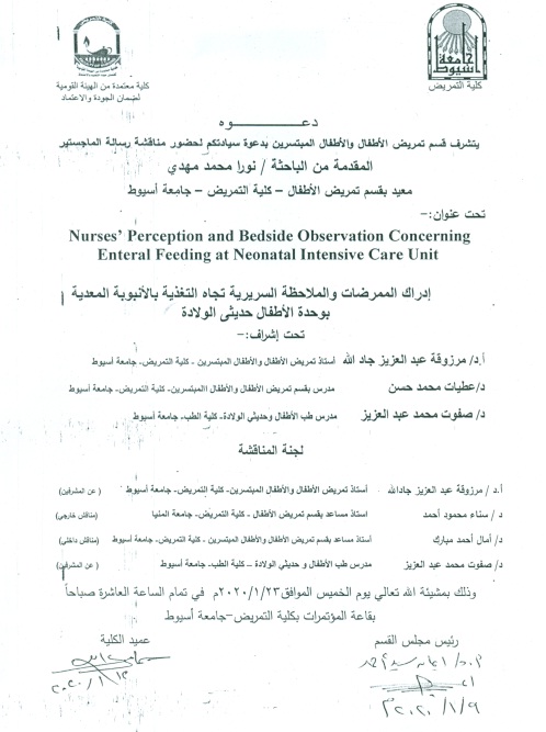 By God willing, doctoral thesis submitted by researcher/ Nora Mohamed Mahdy - Demonstrator, Pediatric Nursing Department, Faculty of Nursing, Assiut University- will be discussed on Thursday, 23/1/2020, at 10:00 a.m., at the conference hall of the college.
