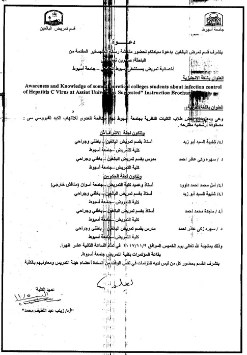 By God willing, master thesis submitted by researcher/ Sabreen Thabet Ali, nursing specialist, Assiut University Hospital- will be discussed on Thursday, 9/11/2017, at 12:00 noon, at the conference hall of the college.
